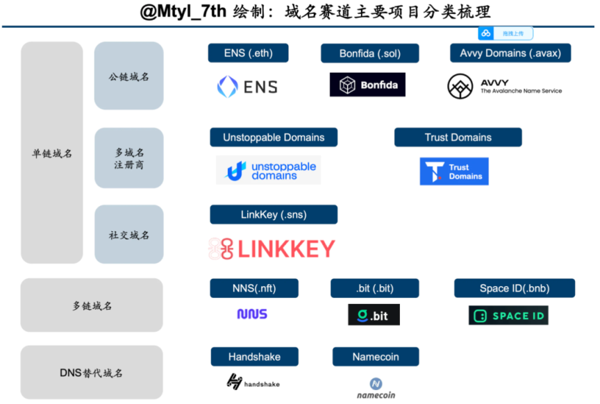 The author divides the current domain name projects into the following three categories: single-chain domain names, multi-chain domain names, and DNS alternative domain names. Among them, single-chain domain names can be further refined. As shown below: