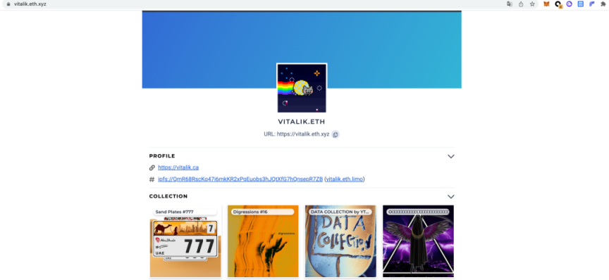 Although "vitalik.eth" cannot be directly input into the browser to be parsed, such as "vitalik.eth.xyz" "vitalik.eth.link" Can. Readers may wish to give it a try. For example, enter "vitalik.eth.xyz" in the browser to see the ENS Profile generated by Vitalik by default; enter "vitalik.eth.link" to see Vitalik's personal homepage:
