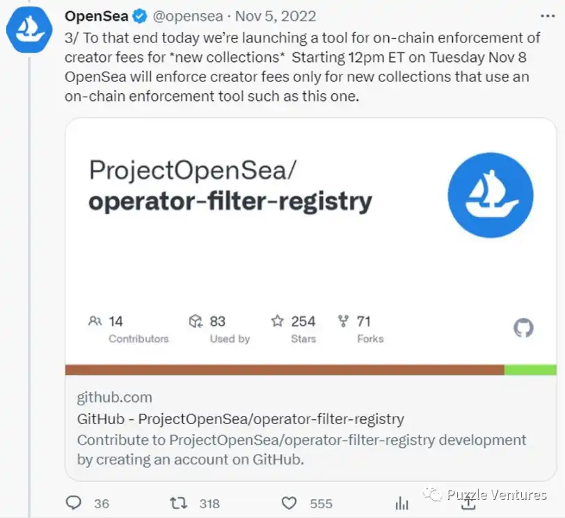 NFT royalty is a payment to be paid to the project side in the sale of NFT, which is set by the project side itself, generally about 5%-10%. However, based on the standard ERC-721 contract, the project side cannot impose royalty, which is realized by the contract of the trading market itself. Because royalty rates are so high that users are reluctant to pay them, many prefer to list in markets where these royalties are optional. Since sellers can gain more profits in the optional royalty market than in the compulsory royalty platform, they are more willing to place orders in the optional royalty market at a lower price, thus bringing down the floor price of the whole transaction market. That is to say, the price of the compulsory royalty market like OpenSea is often higher. This reduces the incentive for buyers to buy on such platforms, and traffic starts to slip away.