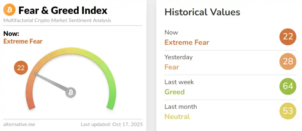 Coinglass data shows that in the past 24 hours, the total net force liquidation of open leveraged positions across the network was $1.189 billion, with long positions liquidated at $935 million. The largest single liquidation occurred on Hyperliquid - ETH-USD, worth $20.4274 million. Alternative data shows that the current market fear index has dropped to 22, entering a state of extreme fear.
