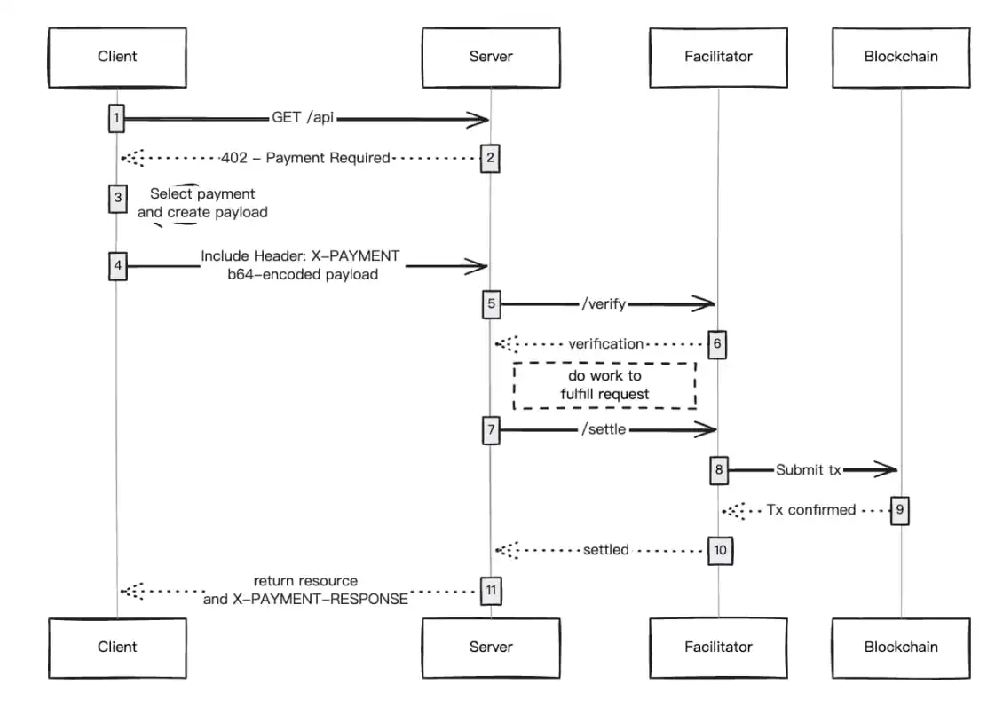 从 x402 支付流程逻辑来看,客户端调用受保护资源并构建支付有效负载;资源服务器(Resource Server)公布支付要求、验证 / 结算支付、满足请求;Facilitator 服务器验证支付有效负载并通过标准端点执行结算;最后区块链网络执行并确认付款。