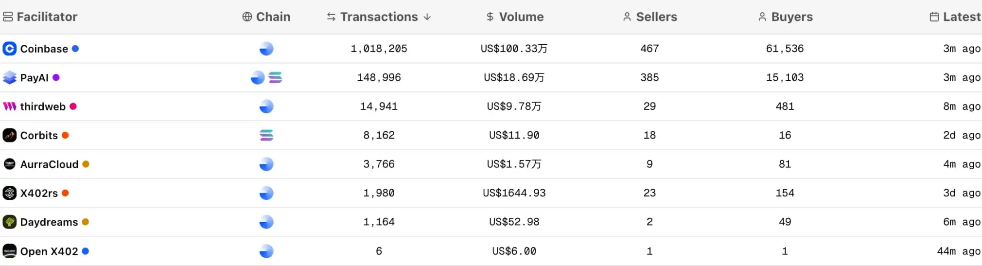 这些 Facilitators 构成了 x402 支付生态的核心基础设施层,负责使用 x402 协议验证和结算 HTTP 资源的链上支付: