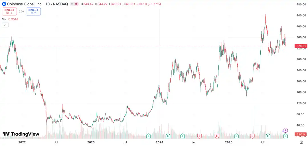 Looking back from 2023 to the present, the stock price of the pioneer crypto exchange, Coinbase, has been like a roller coaster, climbing from a low of $30 to above $300 today, not by luck, but by walking on two legs: Base and USDC.