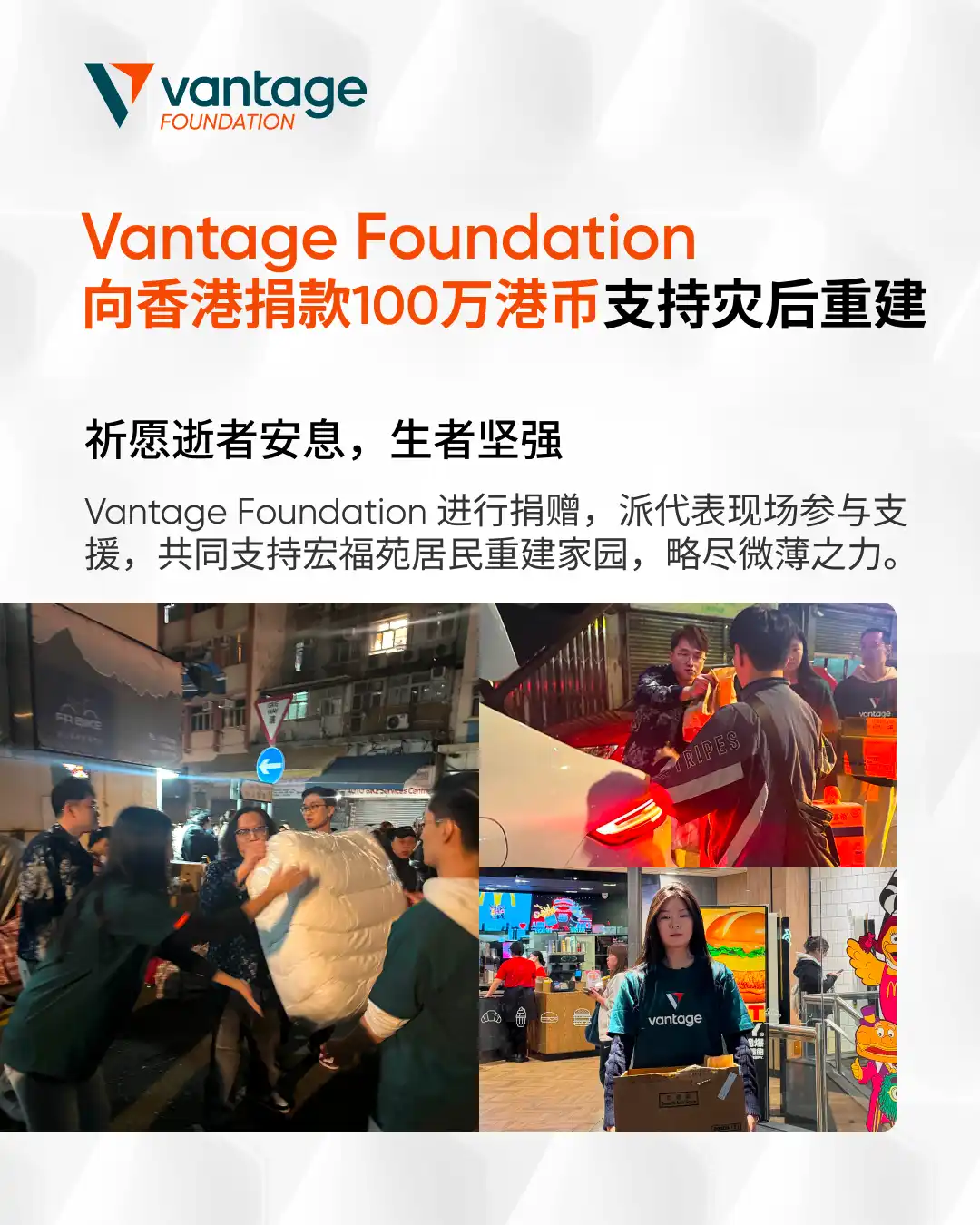 Hong Kong, November 28, 2025 — The Vantage Foundation recently donated 1 million Hong Kong dollars to the rescue and post-disaster reconstruction efforts of the Level 5 fire at the Grand Yoho, Tai Po, Hong Kong. This fire caused severe damage to multiple households, significantly impacting the residents' lives.