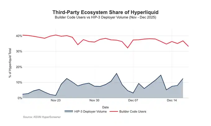 Builder Codes have already demonstrated their effectiveness on the distribution side: as of mid-December, approximately one-third of users did not trade through the native interface but through a third-party frontend.
