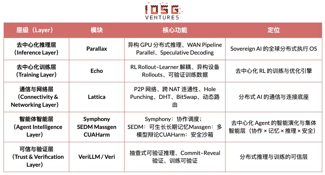 The core vision of Gradient Network is to refactor the AI computing paradigm through the "Open Intelligence Stack." Gradient's tech stack consists of a set of independently evolving, yet heterogeneously collaborative core protocols. The system includes, from bottom-level communication to upper-level intelligent collaboration: Parallax (distributed inference), Echo (decentralized RL training), Lattica (P2P network), SEDM / Massgen / Symphony / CUAHarm (memory, collaboration, security), VeriLLM (trust verification), Mirage (high-fidelity simulation), collectively forming a continuously evolving decentralized intelligent infrastructure.