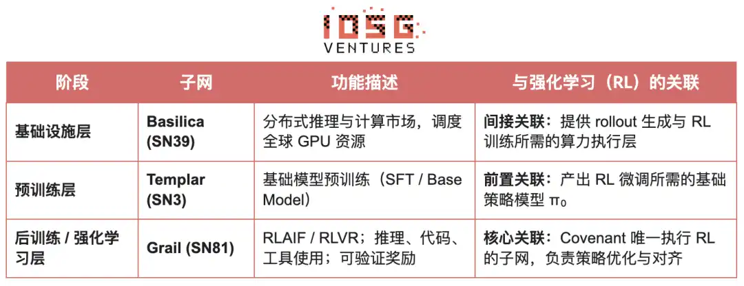 Within the Bittensor ecosystem, Covenant AI has constructed a vertical integrated pipeline from pre-training to RL post-training through SN3 Templar, SN39 Basilica, and SN81 Grail. Specifically, SN3 Templar handles the pre-training of base models, SN39 Basilica provides a distributed compute marketplace, and SN81 Grail serves as the "Verifiable Inference Layer" for RL post-training, supporting the core processes of RLHF/RLAIF, completing the closed-loop optimization from base models to policy alignment.