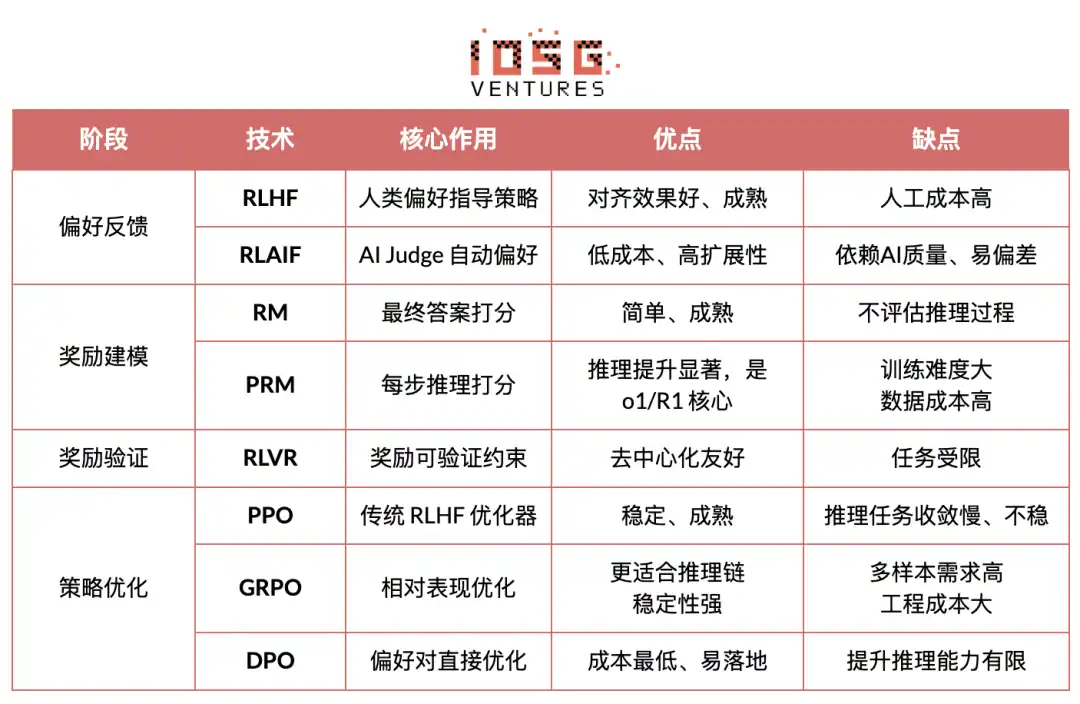 · Post-training consists of multiple iterative stages that determine the model's inference capabilities, values, and safety boundaries. The methods include Reinforcement Learning Hierarchical Framework (RLHF, RLAIF, GRPO), preference optimization methods without RL (DPO), and Process Reward Modeling (PRM), among others. This stage has lower data volume and costs (5–10%) and is mainly focused on Rollout and policy updates. It inherently supports asynchronous and distributed execution, where nodes do not need to hold full weights. By combining verifiable computation and on-chain incentives, an open decentralized training network can be formed, making it the most suitable training phase for Web3.