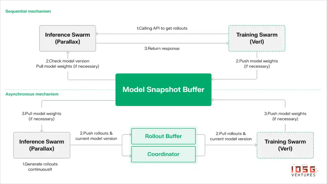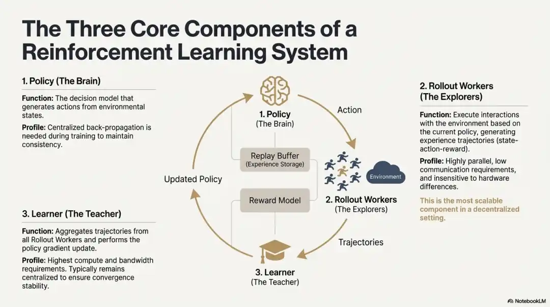 The "Inference-Training Decoupling" naturally fits the decentralized heterogeneous computational power structure: Rollout can be outsourced to an open network, settled based on contribution through a token mechanism, while model updates remain centralized to ensure stability.