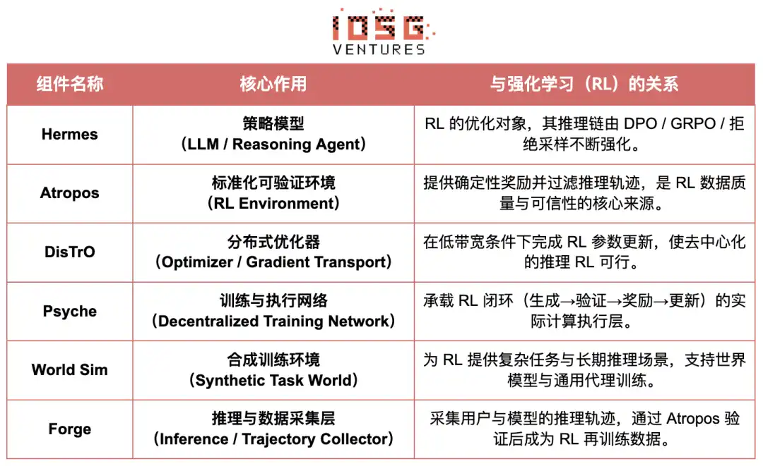 In the Nous architecture, Atropos verifies the thought chain; DisTrO compresses training communication; Psyche runs the RL loop; World Sim provides a complex environment; Forge collects real inference; Hermes records all learning into weights. Reinforcement learning is not just a training phase, but a core protocol in the Nous framework connecting data, environment, model, and infrastructure, allowing Hermes to be a living system that can continuously self-improve on an open-source compute network.