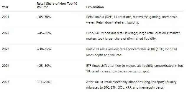 Post-2022 has been painful for altcoins, but it represents a decisive break from a market structure fundamentally unsuitable for scaling. What follows is not a typical market pullback but a regime defined by reflexivity-lacking, leverage-driven liquidity. This absence continues to define the market to this day.