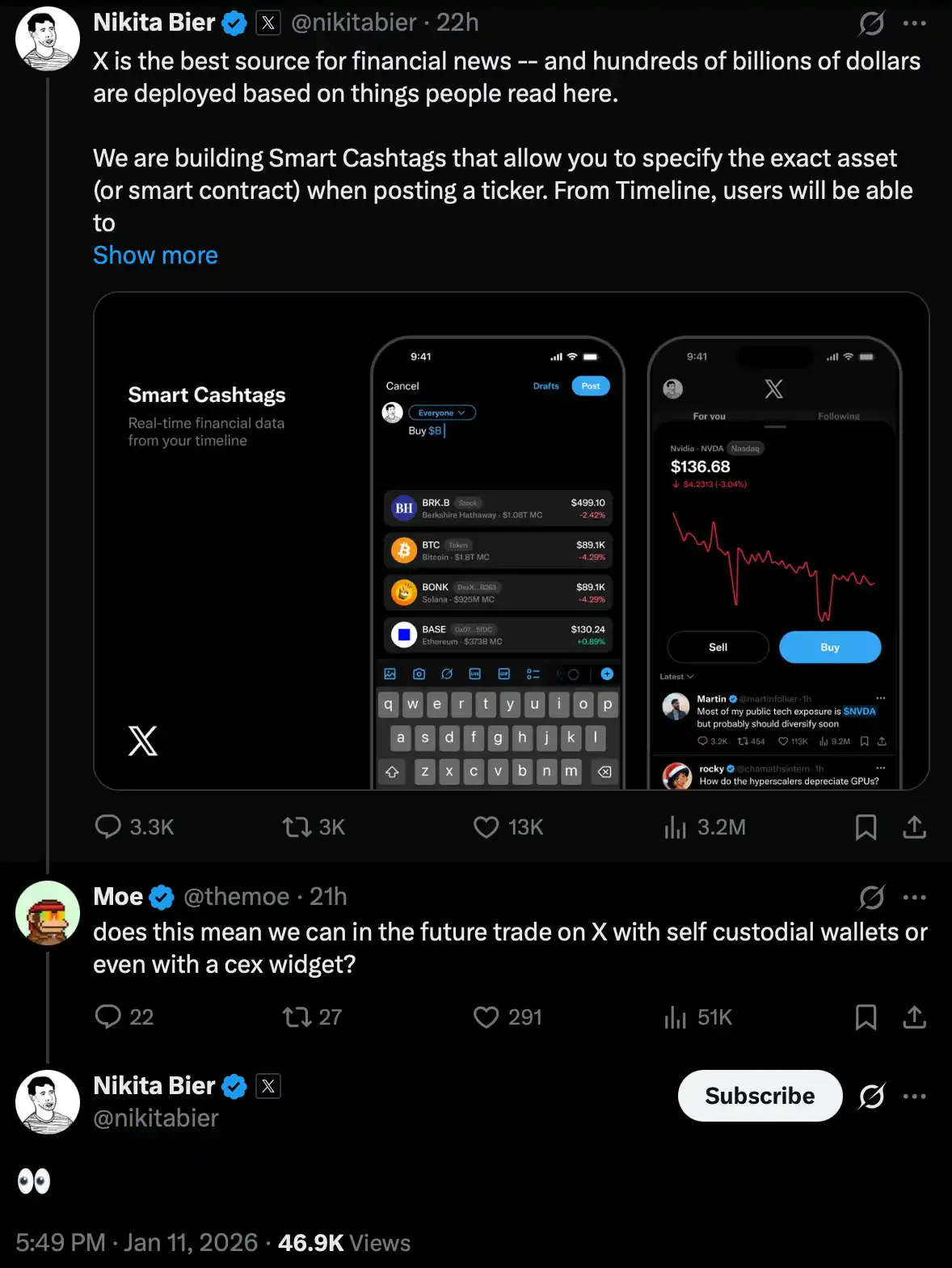 Nikita Bier shared a preview image of the feature in the tweet, where we can see the appearances of $BTC, $BONK, and $BASE, as well as an interface for buying and selling NVIDIA stock.