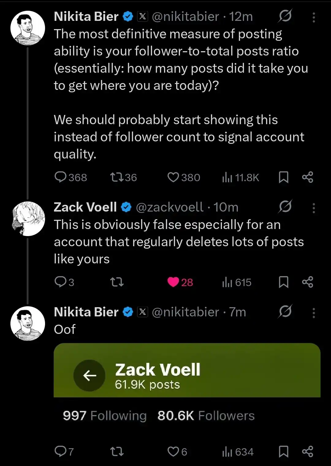 Meanwhile, he continues to engage with people, persistently deleting angry responses. For example, he proposed a metric to measure "posting ability," replacing the simple follower count metric with a ratio of followers to total posts. Someone replied to him, "This clearly doesn't work because you often delete posts." Nikita then sarcastically posted the total post count and follower count of this user: