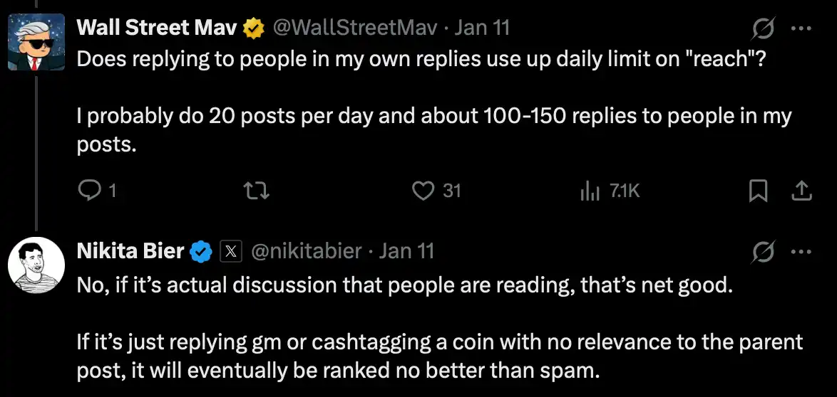 Nikita's updated statement is that only if you aimlessly flood a tweet with 'gm' or promote a coin relentlessly in the comments section without relevance to the tweet's content will it be considered spam and be throttled.