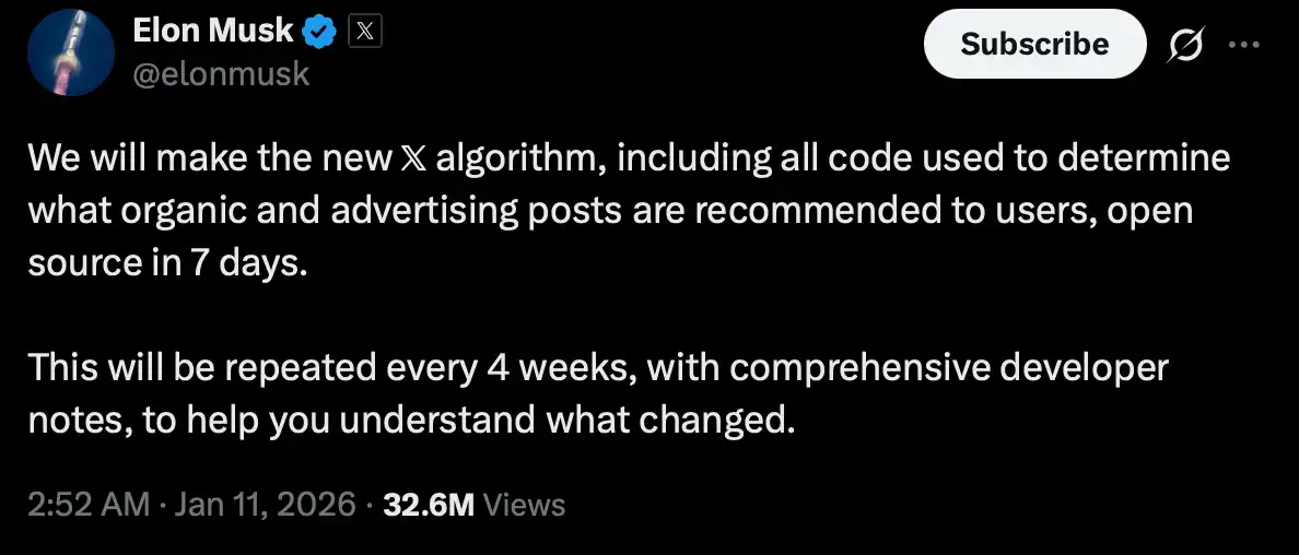 However, after the spread of emotions, this coping mechanism became ineffective. At this point, Musk jumped in with explosive news — the content recommendation algorithm of X is going to be updated, open-sourced within a week, and will receive updates every 4 weeks, continuously open-sourcing the updates. At this stage, the "Coinfate Lives" movement has unleashed astonishing energy — never before has a top-tier social media announced plans to open-source its content recommendation algorithm, marking a historic first. This all unfolded after the crypto community collectively retaliated against Nikita in anger.