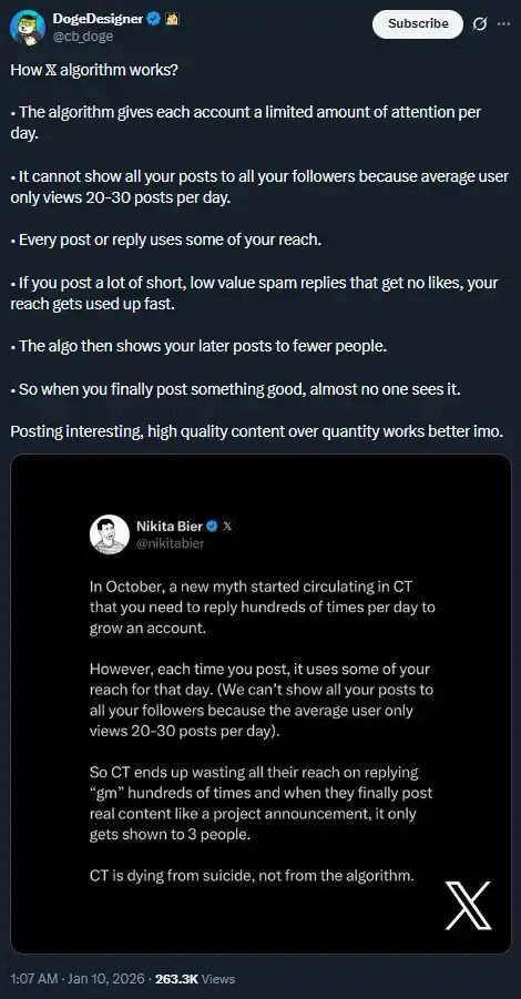 "In October of last year, a new rumor began spreading on Crypto Twitter, claiming that as long as you engage in a large number of daily comments, you could boost engagement. The reality is, each time you tweet, it consumes your daily exposure, and we cannot show all your tweets to your followers every day, as the average user only reads 20-30 tweets per day."