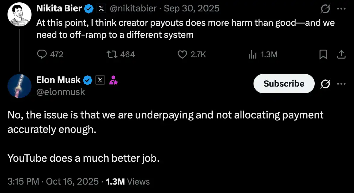 However, if even a social network cannot suppress competitors like Threads, how can it become the "Everything App"? Therefore, Musk said, "We still pay creators too little, and the distribution is not good enough; YouTube does much better in this regard than we do."