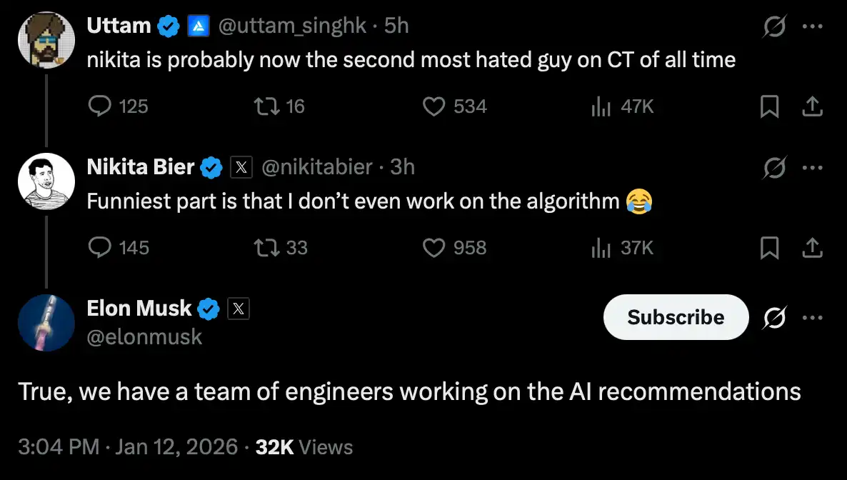 So, the root cause of the whole event is almost explained. In fact, Nikita is not responsible for X's content recommendation algorithm, but inadvertently, he almost overnight became the most hated person in the crypto community. He himself found this situation quite amusing, and even more amusingly, Musk once again came out to clarify — Nikita indeed has no relation to the content recommendation algorithm; we have a team of dedicated engineers working on that.