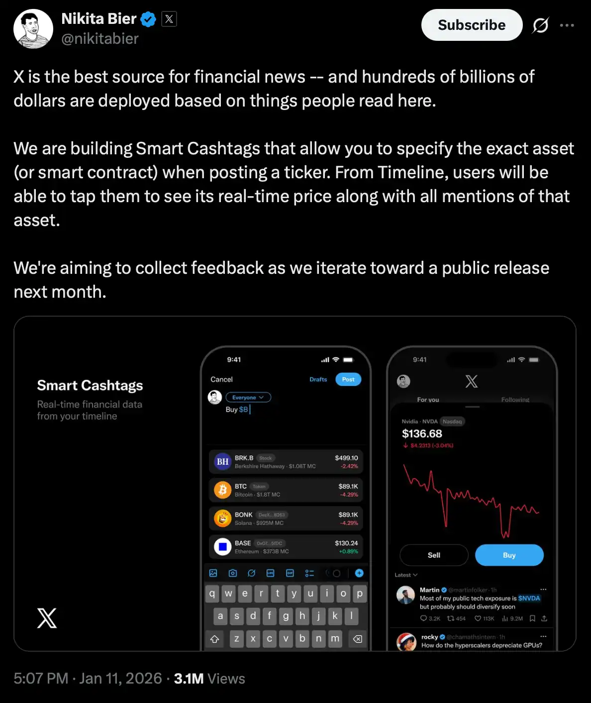 On January 11, X (Twitter) Product Lead Nikita Bier announced that the Smart Cashtags feature will be publicly launched next month. This feature will allow asset tickers appearing in tweet content to be accurately linked to the referenced asset, especially cryptocurrencies that can be accurately linked based on the token's contract address. When users click on these tickers in tweets, they will be able to see the corresponding real-time price trends and all discussions on X around that asset.