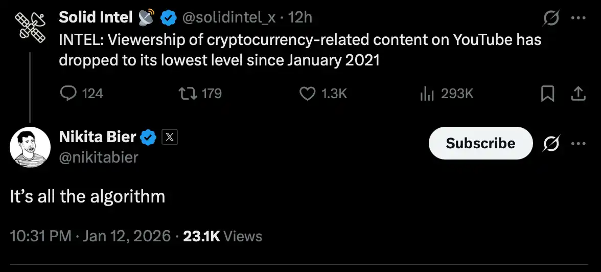 "Cryptocurrency Content Views on YouTube Drop to Lowest Level Since January 2021," Nikita: "All Because of the Algorithm"