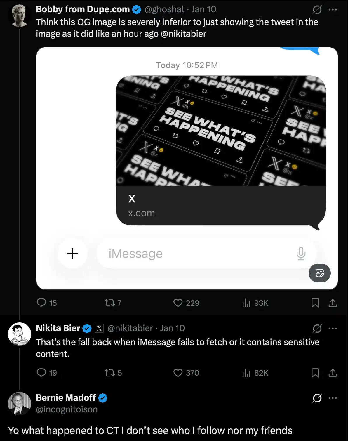 Nikita Bier is often seen under various tweets related to X product issues, and as a product lead, he surfs on X quite a bit every day. Originally, he just answered a simple question—someone thought it would be better if tweet links shared on iMessage directly displayed the tweet content as the link preview image. He replied that this happens when iMessage fetches an error or includes content from sensitive tweets. Then, at this moment, a crypto player followed up under Nikita's reply, saying, "Yo, what's up with crypto Twitter? I can't see either the people I follow or my friends' (posted content)."