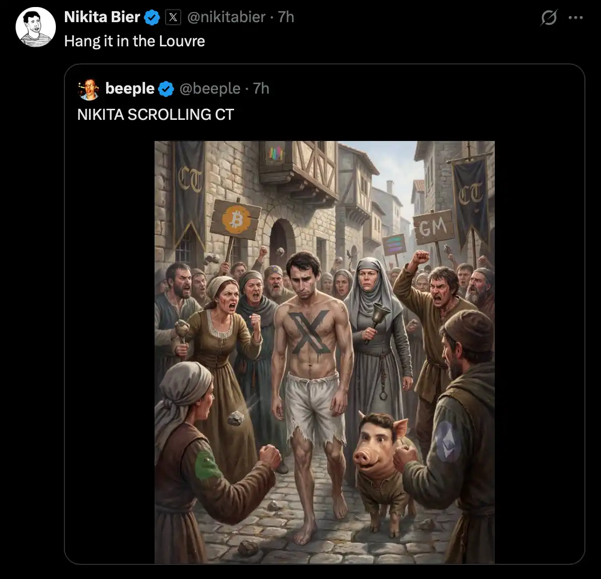 Beeple also took this pig image meme and created a meme image criticizing Nikita in the crypto community. In response, Nikita said that this artwork should be hung in the Louvre. He even posted this image on his Instagram with a caption, "Unlocked Achievement: Become Beeple's creation."