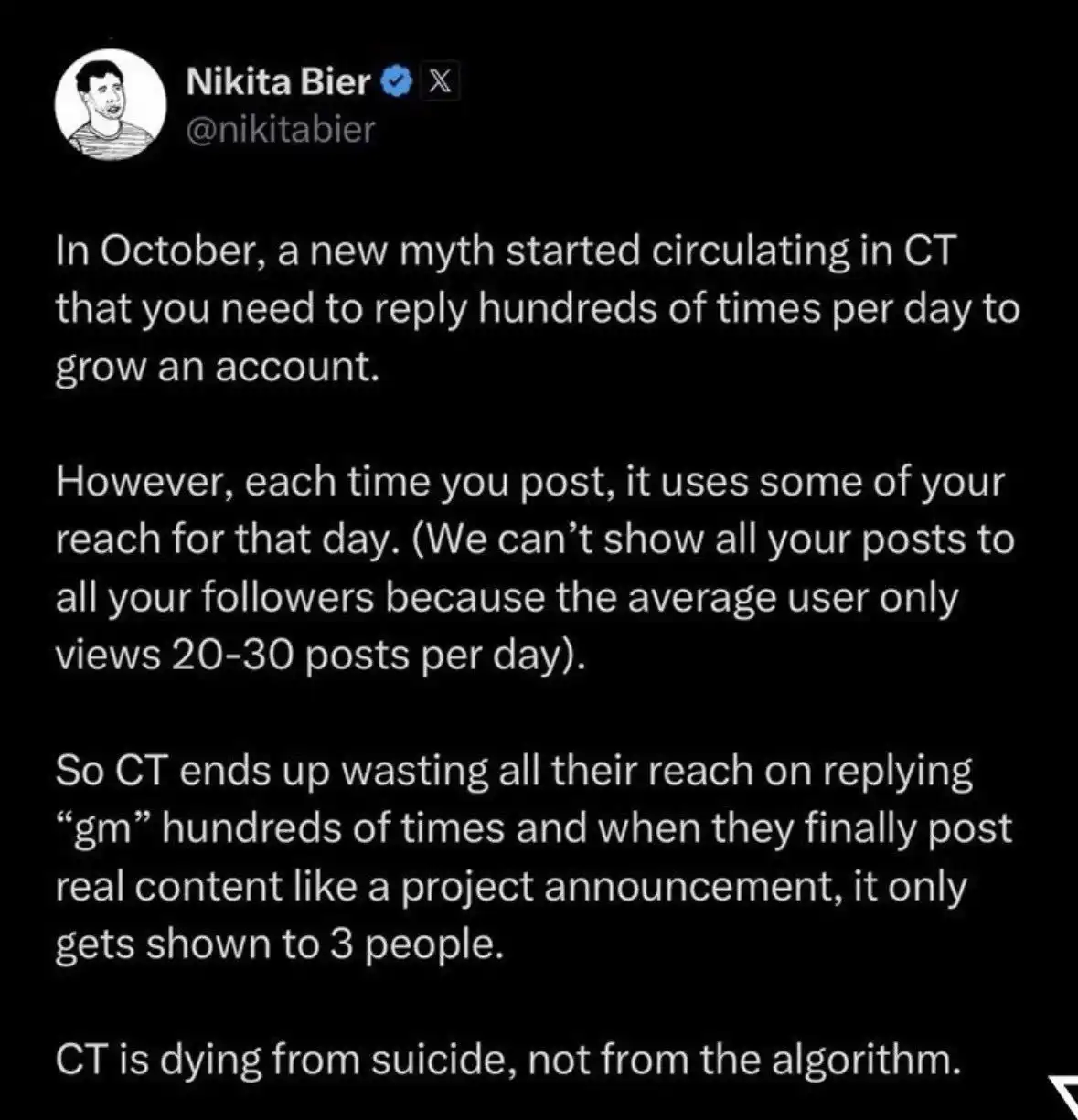 "Crypto Twitter users waste their daily exposure by excessively posting 'gm' greetings, and then when they want to post serious content, such as an announcement about a project, they have no exposure left and then blame the algorithm for being unfriendly to Crypto Twitter. Crypto Twitter is self-sabotage, nothing to do with the algorithm."