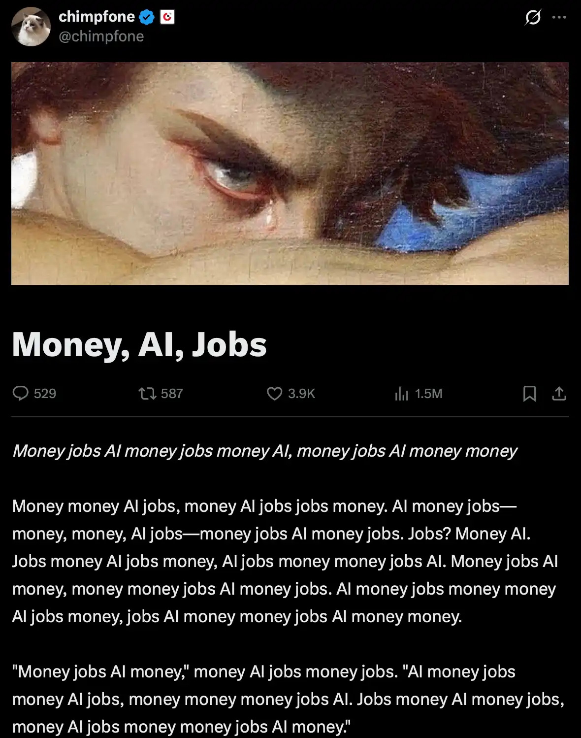 Above is an article from chimpfone titled "Money, AI, Jobs," containing only these three words throughout, mocking Nikita's "garbage information theory." This creative approach received recognition and praise from Solana: