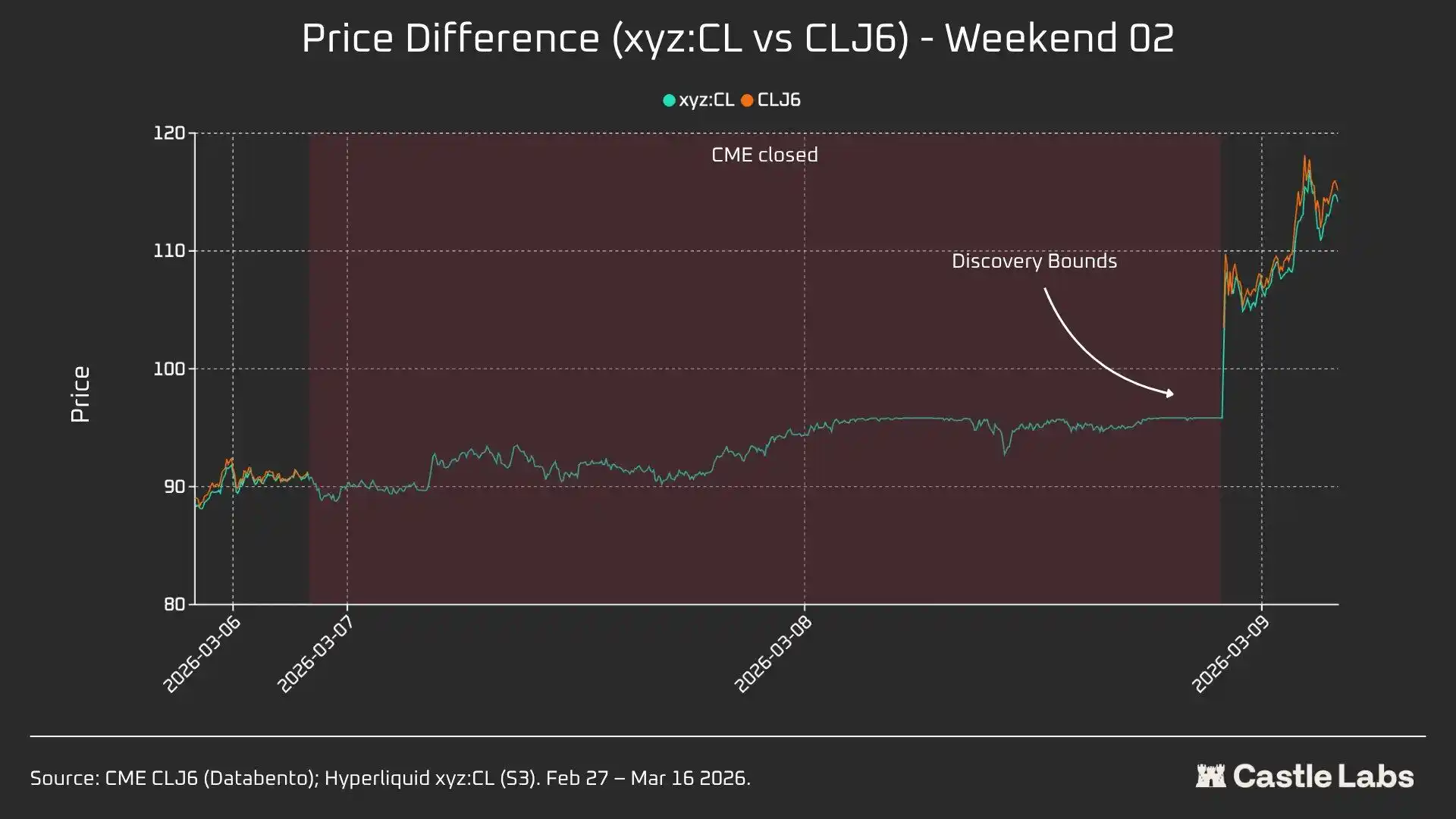 During active trading hours, Hyperliquid's xyz:CL closely tracks CME's CLJ6, but as oil prices increase, a structural discount emerges and widens, likely due to funding rate pressure from accumulated long positions. Over the weekend when CME is closed, Hyperliquid's price discovery is further constrained by the Price Range mechanism (DB). In the absence of a real-time reference market, this mechanism limits the fluctuation range of the mark price.