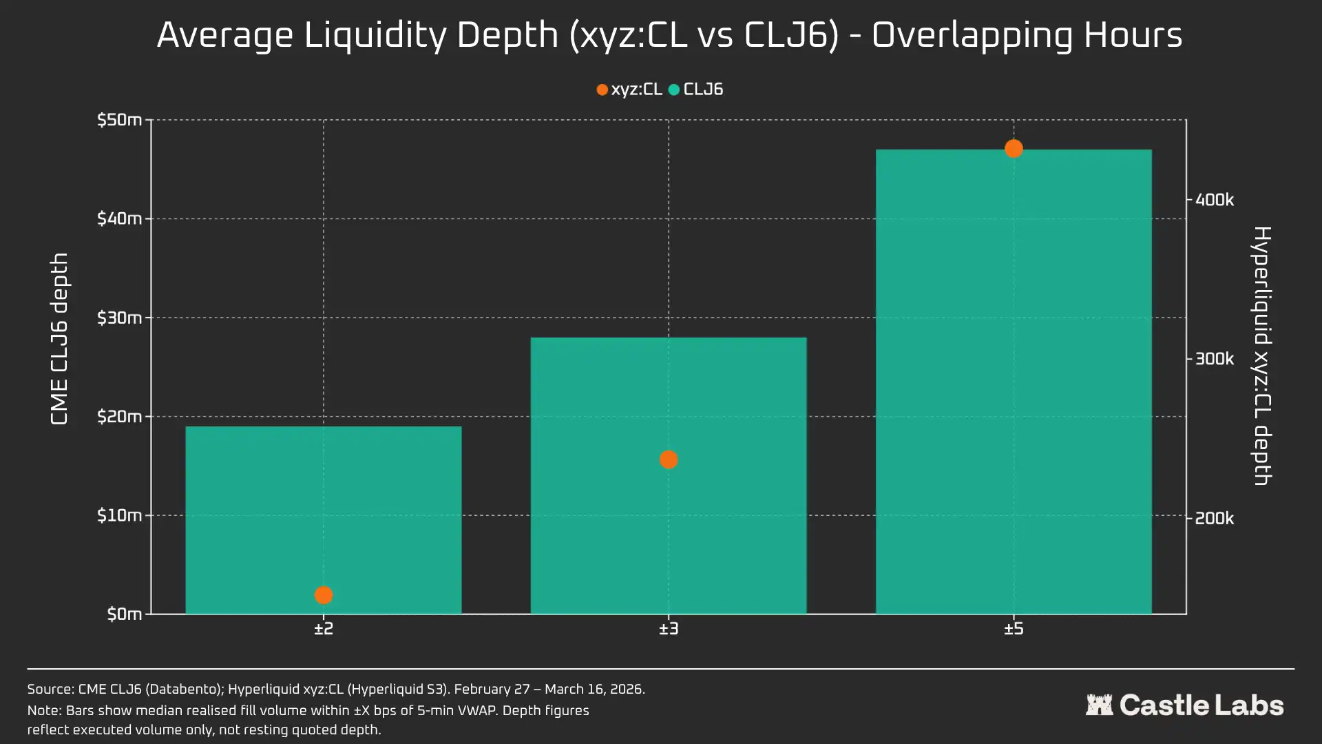xyz:CL launched at the beginning of 2026, meaning the observation period of these three weekends covered the early maturity phase of the Hyperliquid market. Observed trends, including increased liquidity depth, trading volume, and user growth, partly reflected market maturation. However, we believe that on-chain trading platforms currently cannot match traditional trading platforms in absolute metrics like liquidity depth or slippage.