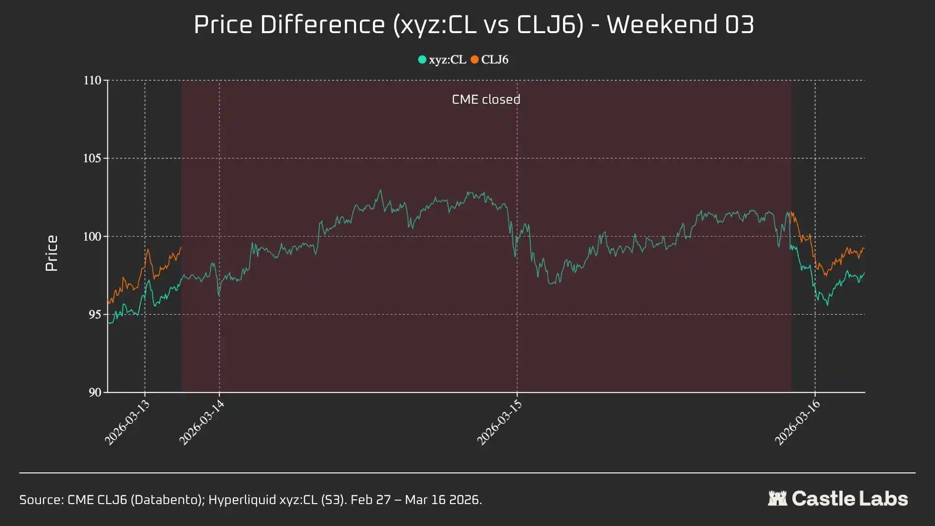 The second weekend was the real test as xyz:CL touched the range boundary price at the market close. The opening price for CLJ6 was $98 (a 737 bps increase from the $91.27 closing price), while xyz:CL peaked at around $95.83, capturing only a 68% gain.