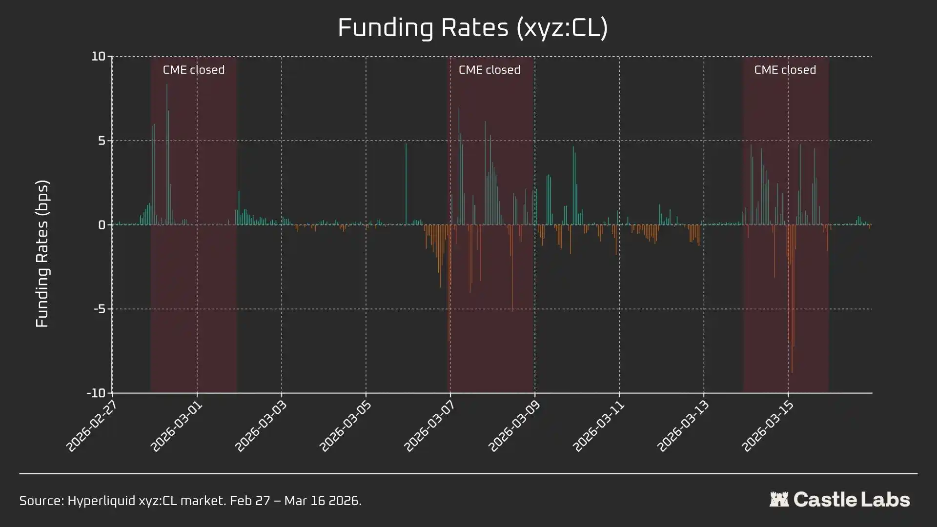 Overall, these three snapshots illustrate a structural shift in the xyz:CL market on the Hyperliquid platform, transitioning from an emerging market constrained by DB price discovery (Weekends 1 and 2) to increasingly free price discovery with over- and undershooting (Weekend 3).