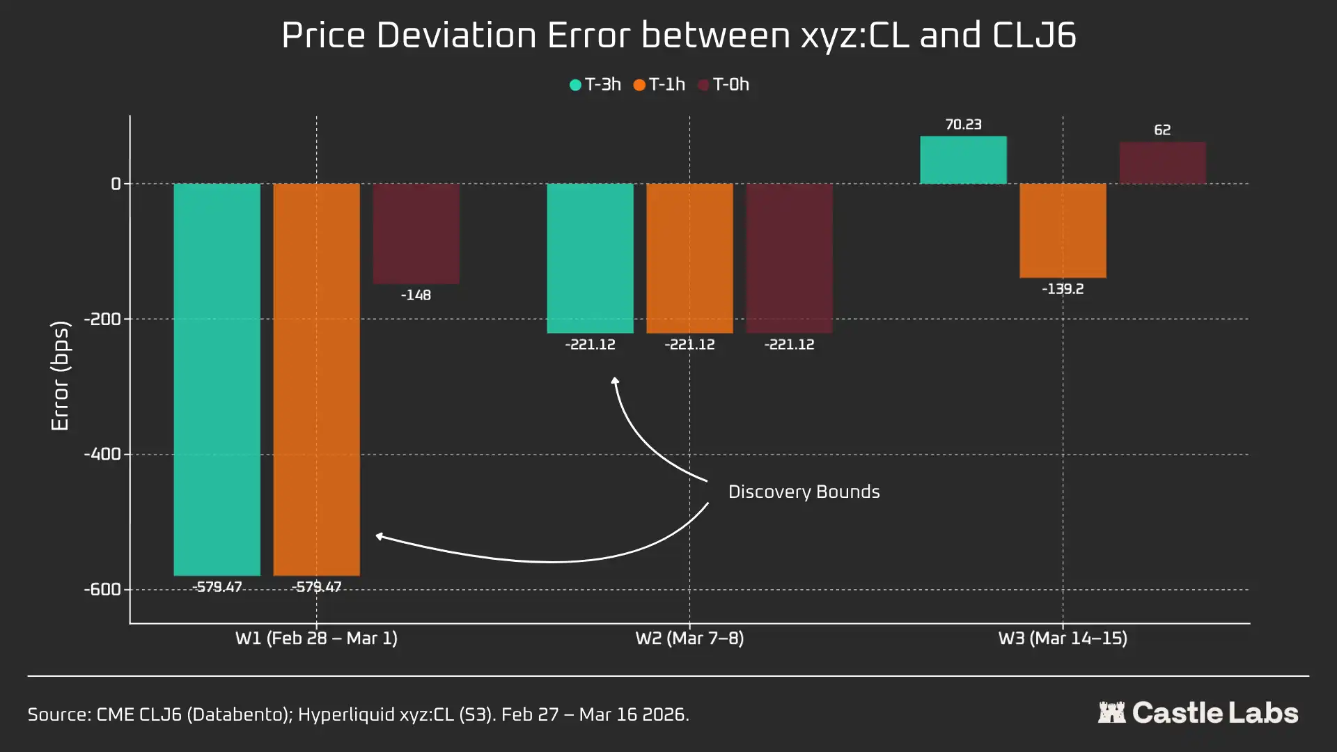 By analyzing the price deviation errors at different time intervals before CME's opening for each weekend (3 hours, 1 hour, 0 hours), it was found that the data from Week 3 is the most reliable, as the xyz:CL market was influenced by DB in the previous two weekends. In Week 3, the price deviations for xyz:CL were approximately +70 bps and -139 bps in the 3-hour and 1-hour periods before CME's opening, indicating its improved price discovery compared to the earlier analyzed weekends.