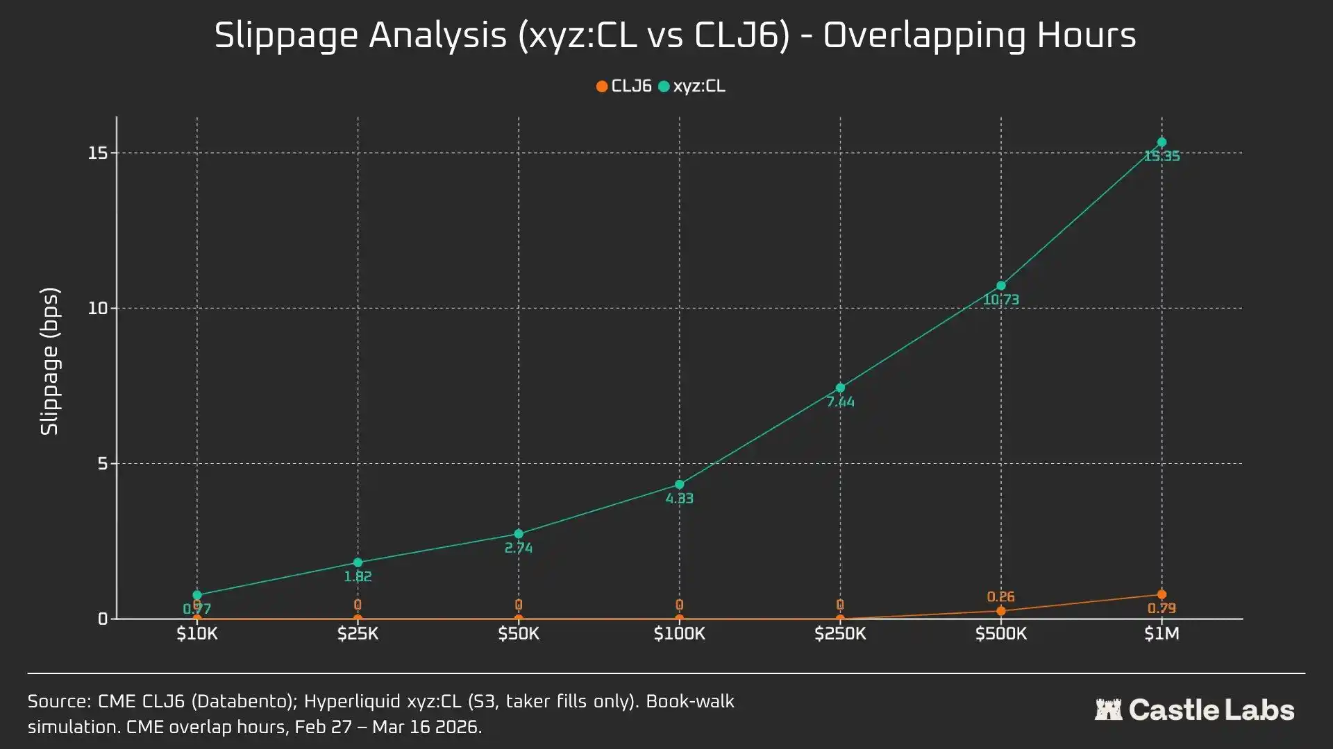 At a $1,000,000 trade size, Hyperliquid's 15.4 basis points is approximately 20 times CME's 0.79 basis points, confirming that the trading venue currently lacks the capability to handle institutional-level orders. Given Hyperliquid's average trade size, the platform could easily provide equally high-quality service to users without generating slippage.
