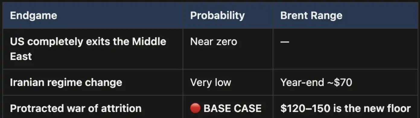 The author further points out that the key misjudgment in the current market is not in price, but in time. The futures curve still implies a premise: that the conflict will end in the short term and supply will recover. However, the more likely path is a prolonged war of attrition. This means that the high oil price is no longer a temporary shock but will evolve into a more enduring structural state, with the range shifting or moving up to $120–150.
