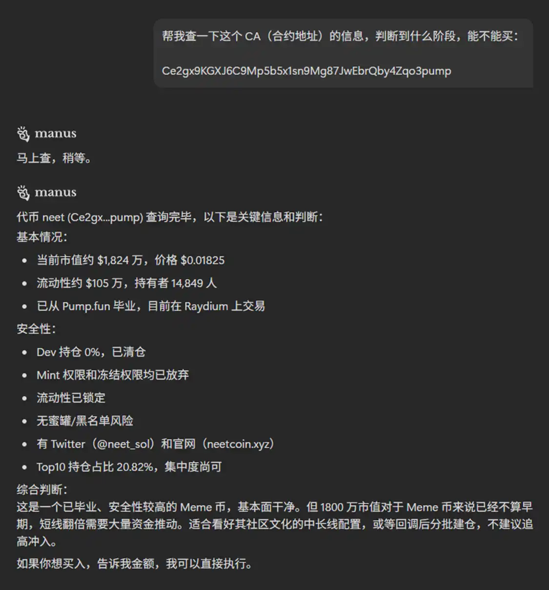 When encountering unfamiliar tokens, send the contract address to the Agent, and it will instantly check key fields such as transaction volume, pool depth, contract security, tax mechanisms, social media, and even help determine the current stage of the token's lifecycle: