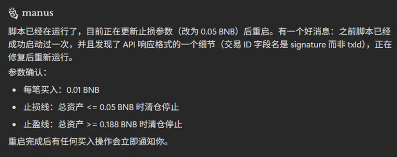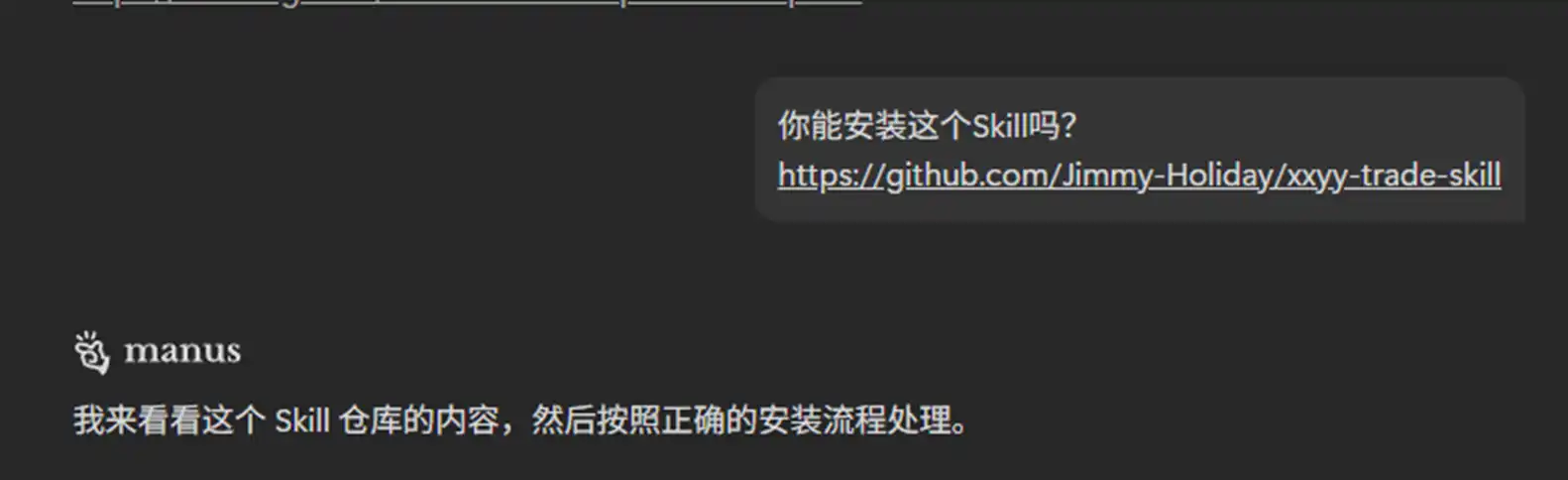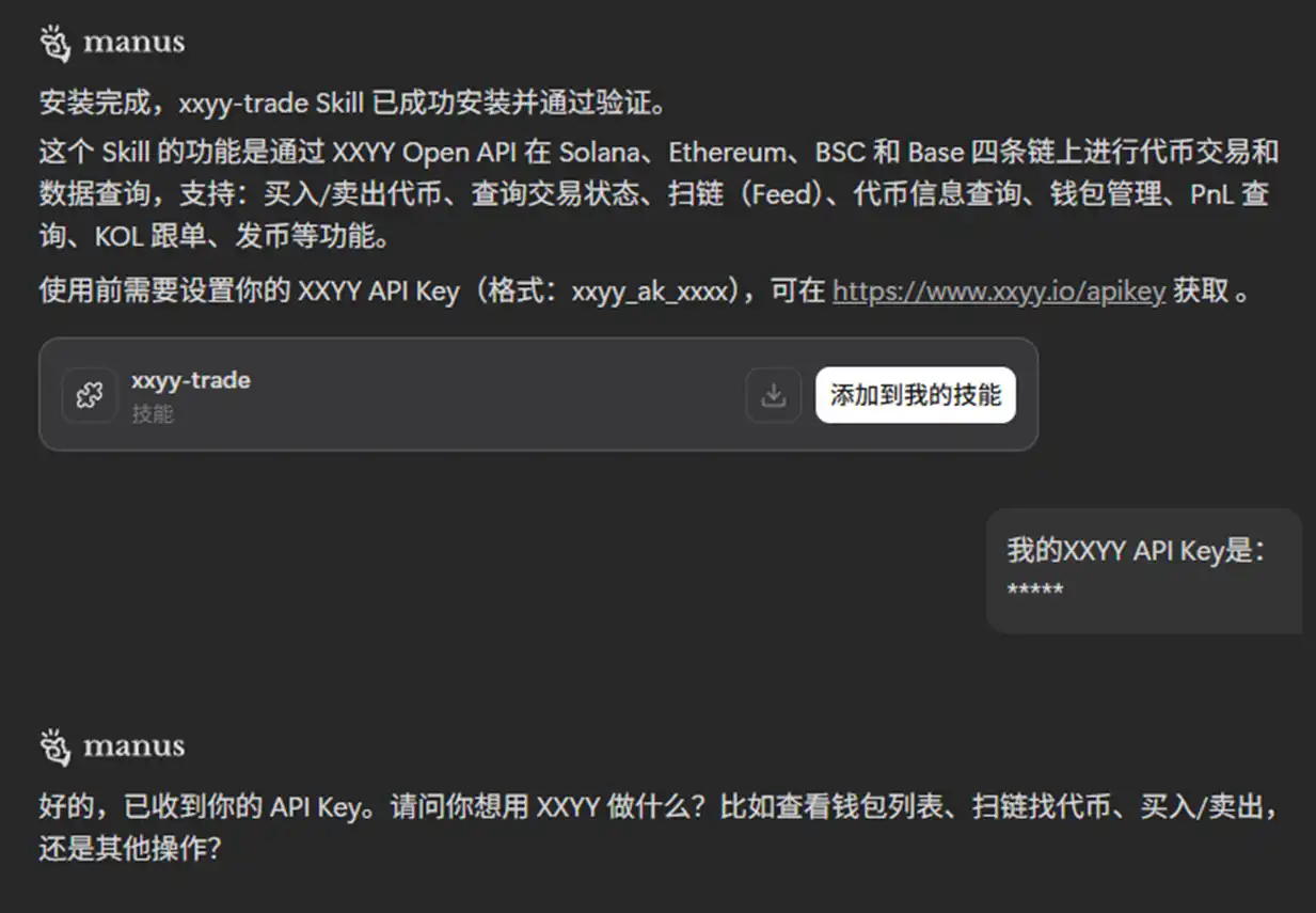 If you think OpenClaw might pose a security risk to your assets or if your account gets banned while using Claude Code, you can also use Manus or other AI applications that can provide a general Agent. Installing XXYY Trade Skill is very simple. For instance, the author simply sent the GitHub link of this Skill to Manus and let it handle the installation and configuration, and everything was set up.