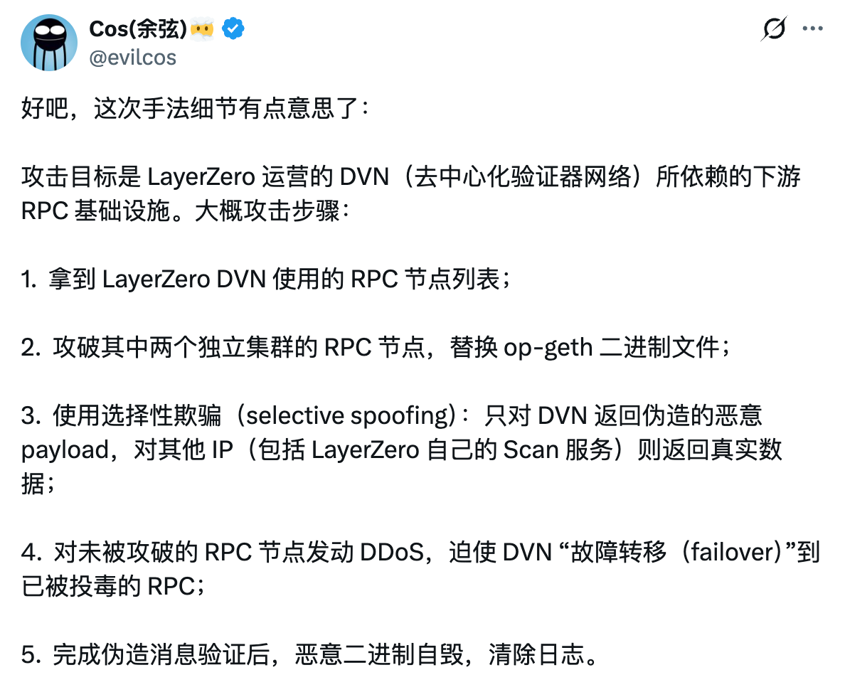 According to details disclosed by LayerZero, the direct cause of the incident is quite clear. The decentralized validator network (DVN) operated by LayerZero relied on downstream RPC infrastructure that was compromised (see the analysis by SlowMist founder, Cosine, below), and because Kelp DAO's bridging contract adopted a 1/1 DVN, the attacker only needed to complete a forged message verification to execute the attack.