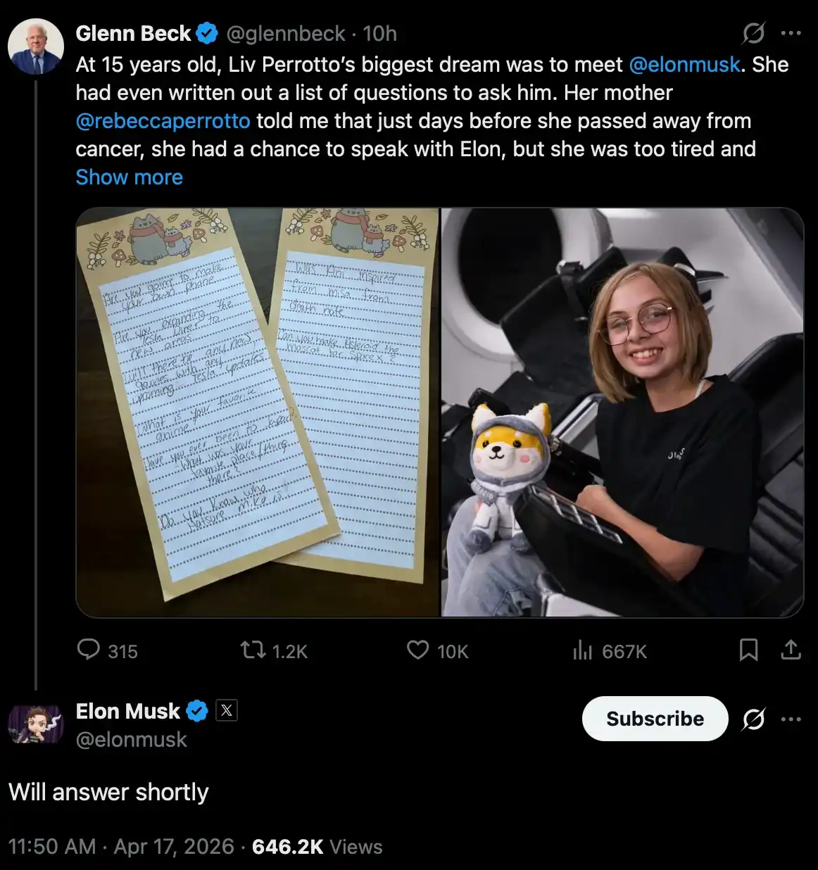 A few days ago, SpaceX founder Elon Musk replied to a post by media personality Glenn Beck on X. The post mentioned that a teenage girl, before succumbing to cancer, hand-designed a Shiba Inu plushie named Asteroid and sent it on SpaceX's 2024 Polaris Dawn mission. The plushie served as a zero-gravity indicator inside the spacecraft, being the first thing to float when humans entered weightlessness. One of the girl's final wishes was for Asteroid to become the official mascot of SpaceX.