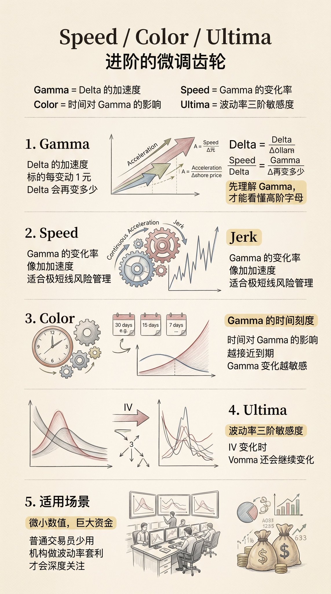 Speed is the rate of change of Gamma. In physics, if Delta is velocity and Gamma is acceleration, then Speed is jerk. It measures how Gamma itself changes as the underlying asset price continues to move. This is crucial for managing ultra short-term, highly volatile high-frequency positions.