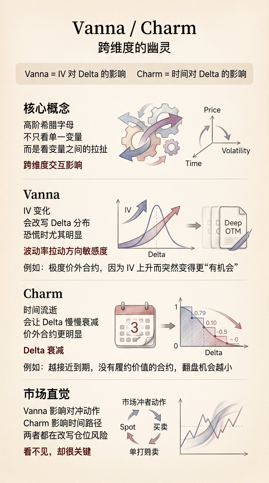In modern quantitative research, what truly fascinates advanced traders are the Greek letters that capture the cross-dimensional interaction effects, with the most famous being Vanna and Charm.