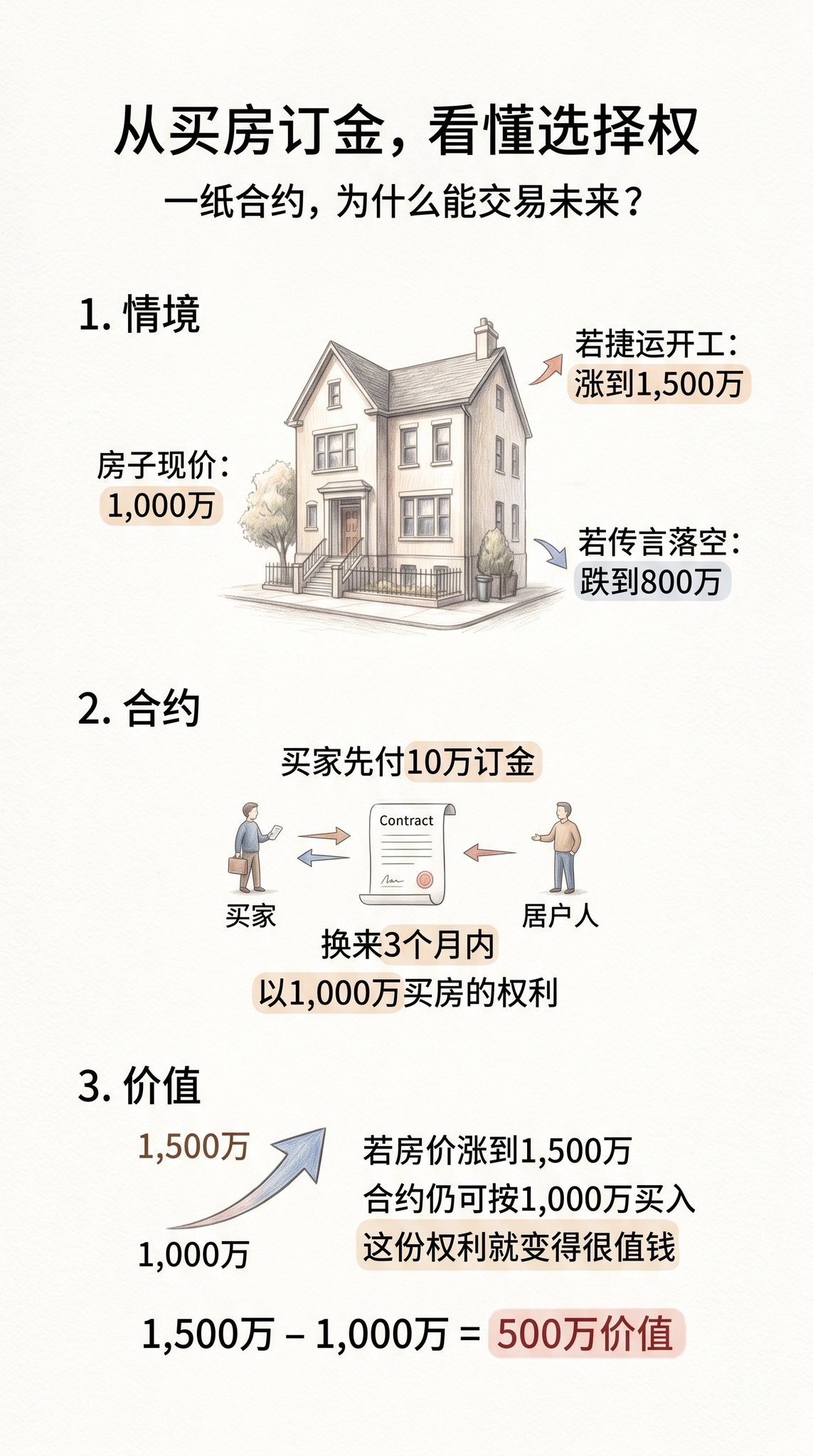 The homeowner, considering the current market conditions, sees the 100,000 RMB as guaranteed cash flow. Even if the buyer backs out of the purchase after three months, the house will still be retained, and the 100,000 RMB will be in hand. Therefore, the homeowner agrees to sign. This model is a standard Call Option transaction in the financial market.