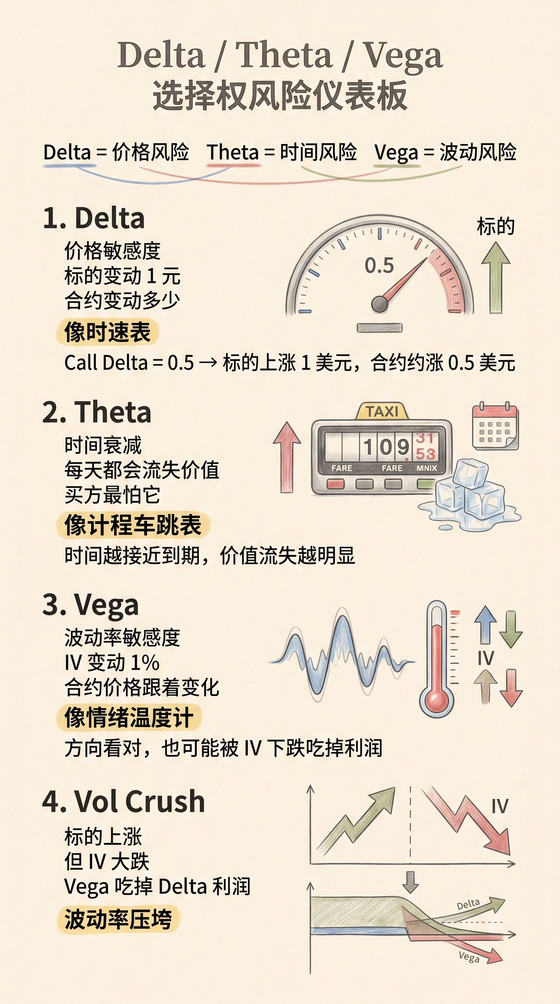 From the fundamental Delta to the complex Vanna, these letters reveal the ultimate truth of options trading: what you buy or sell is never a one-dimensional asset but a four-dimensional space woven by price, time, volatility, and probability.