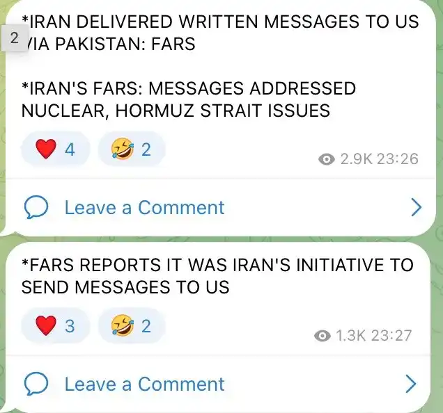 From 23:26 to 23:27 on Sunday, the Iranian state media Fars News Agency issued two successive breaking news posts - Iran has submitted written information to the U.S. through Pakistan, covering the nuclear issue and the Strait of Hormuz, and emphasizing that "this is Iran's initiative to communicate".