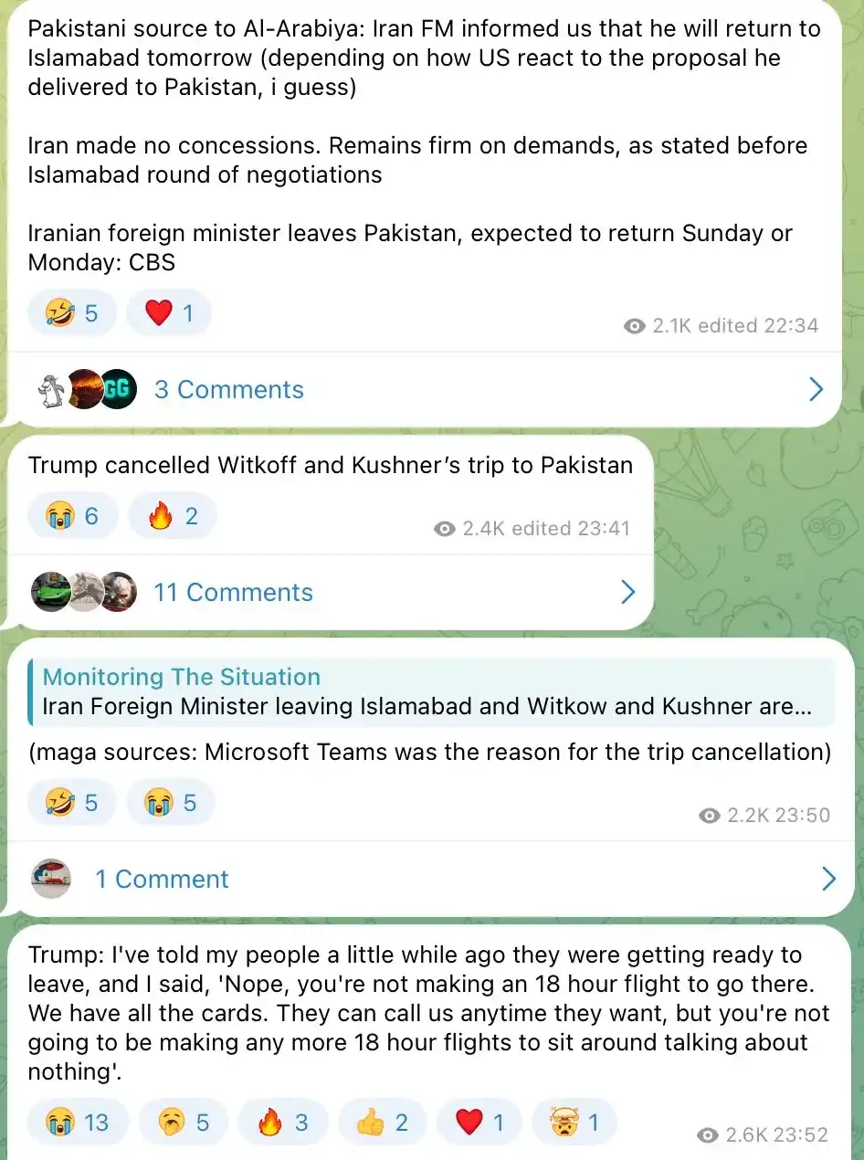 At 22:34 on Saturday, a Pakistani news source revealed to Al-Arabiya: "Although the Iranian Foreign Minister planned to return to Islamabad on Sunday, 'Iran has not made any concessions, and their position remains the same as before the Islamabad negotiations began'." CBS quickly followed up with a report that Araghchi had left Pakistan. Iranian Foreign Ministry spokesperson Esmaeil Baqaei simultaneously confirmed on Twitter: "There is no planned meeting between Iran and the United States."
