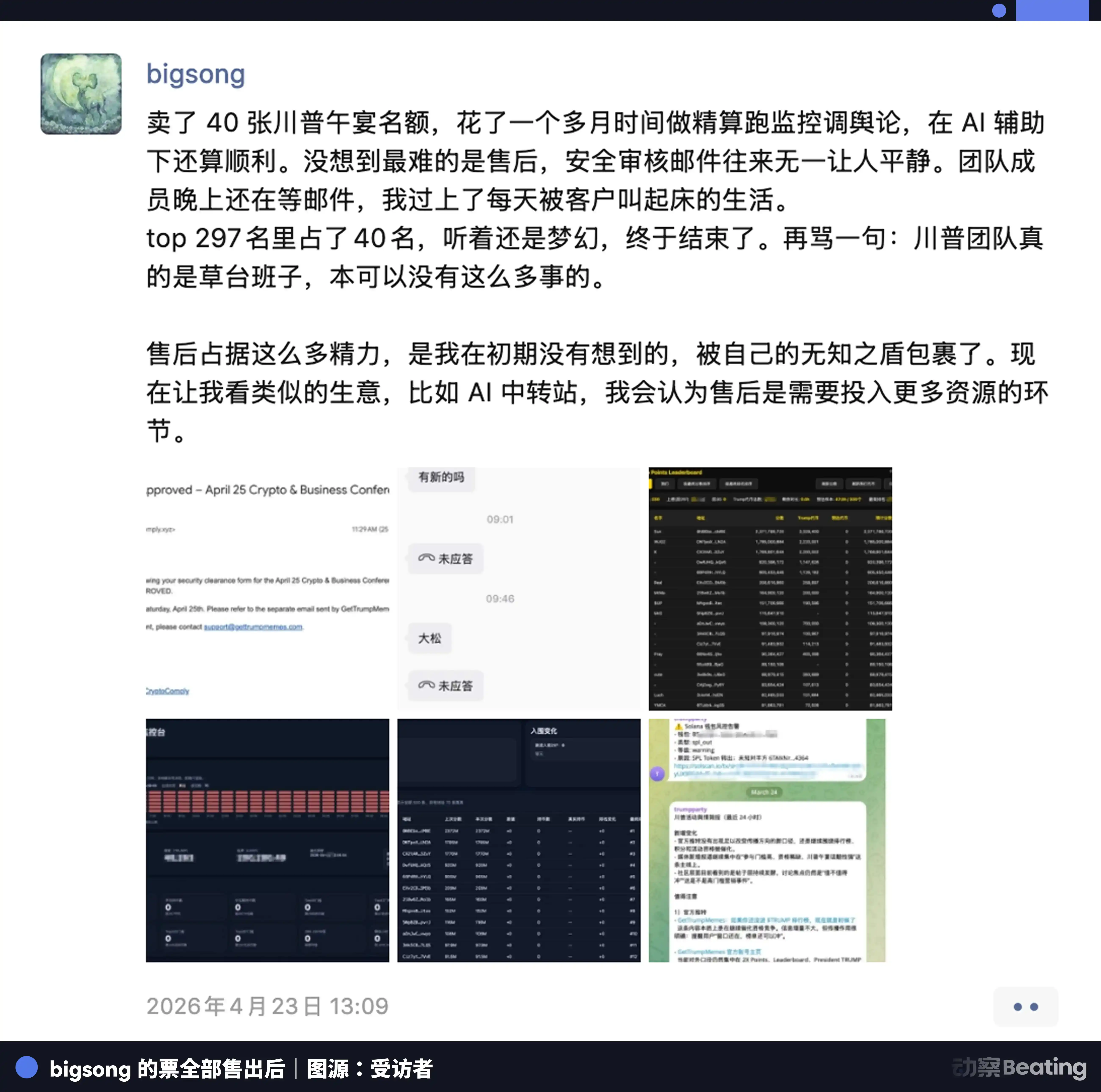 Returning to bigsong's business, he applied a methodology of quantitative trading, grafting onto a traditional scalper distribution chain, transforming the act of "meeting the U.S. President" into a commoditized deliverable.