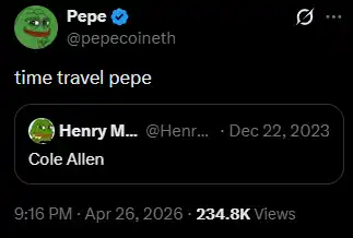 This also caught the attention of $PEPE, the official account on the ETH mainnet. As their avatar is a sad frog, the $PEPE official account referred to them as the "Time Traveling Sad Frog."
