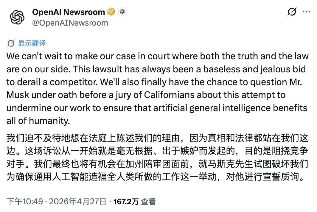 OpenAI's strategy is nearly a mirror image. They aim to persuade the jury that Musk's true motive for filing the lawsuit is competitive jealousy, unrelated to trust violations. On the day of the jury selection, the official OpenAI account fired the first shot: "We cannot wait to present our evidence in court; the truth and the law are on our side. This lawsuit has always been a groundless, jealousy-driven competitive suppression... We finally have the opportunity for Musk to testify under oath in front of a California jury."